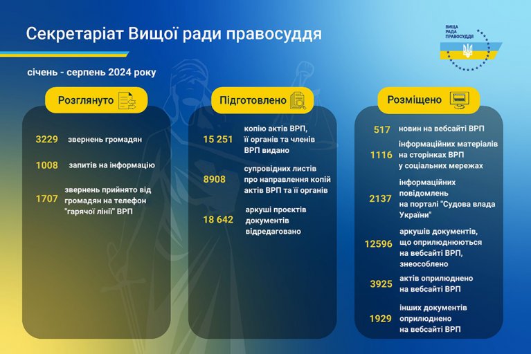 Протягом січня – серпня 2024 року на офіційному вебсайті Вищої ради правосуддя оприлюднено: 3925 актів ВРП, 1929 інших документів, 517 новин та повідомлень; у соціальних мережах ВРП розміщено 1116 інформаційних матеріалів.