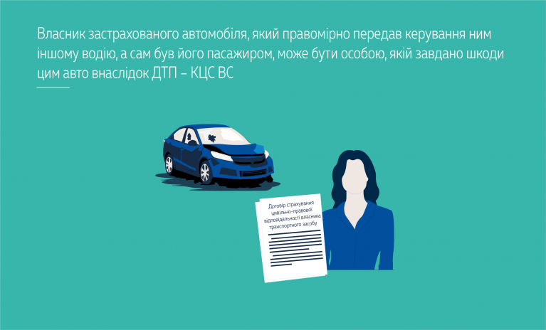 Суди не звернули уваги, що особою, яка завдала шкоди та відповідальність якої застрахована, може бути і не власник ТЗ (не страхувальник, не особа, яка вчиняла договір обов’язкового страхування цивільно-правової відповідальності зі страховиком) за умови правомірного володіння такою особою забезпеченим ТЗ. Власник ТЗ, який правомірно передав володіння забезпеченим транспортним засобом, а сам був його пасажиром, може бути особою, якій завдано шкоди забезпеченим ТЗ.