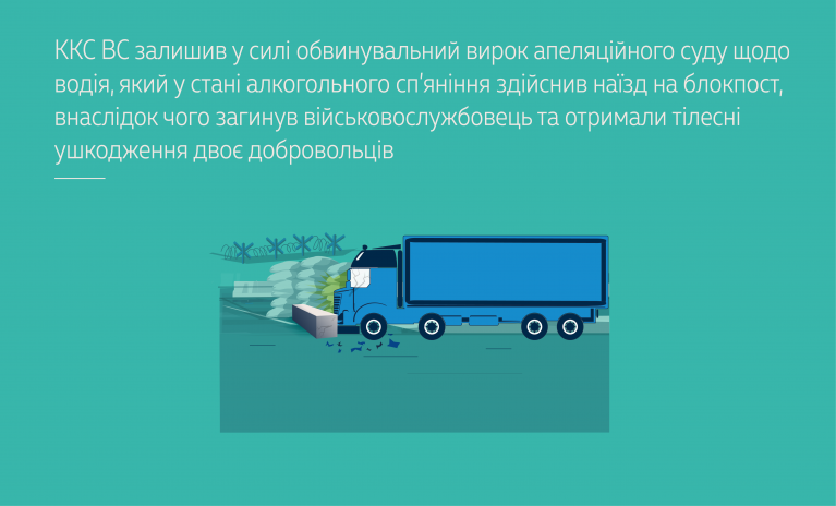 За матеріалами справи засуджений, грубо порушуючи вимоги підпунктів «б» і «д» п. 2.3, п. 12.3 ПДР, перебуваючи в стані алкогольного сп’яніння, допустив зіткнення з легковим автомобілем, а після того – з бетонною огорожею стаціонарного блокпосту, за якою знаходилися один військовослужбовець та два добровольці, і, продовжуючи рух, здійснив на них наїзд. Внаслідок цієї ДТП військовослужбовець загинув на місці події, а добровольці отримали тілесні ушкодження середньої тяжкості.