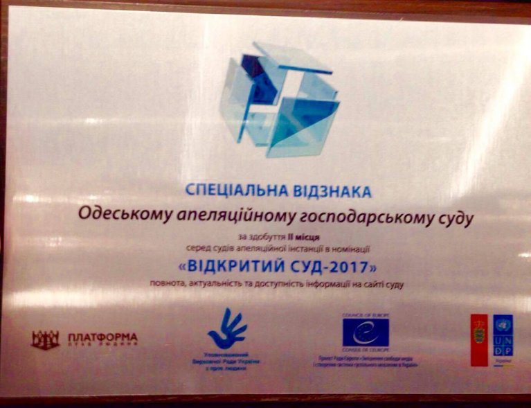 Одеський апеляційний господарський суд отримав спеціальну відзнаку за здобуте 2 місце серед судів апеляційної інстанції в номінації «ВІДКРИТИЙ СУД – 2017» за повноту, актуальність та доступність інформації на сайті суду.