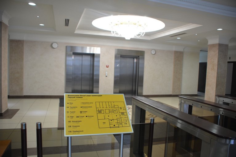 При вході до будівлі розміщено мнемосхему розташування об’єктів на першому поверсі Вищої ради правосуддя із написами, дубльованими шрифтом Брайля для осіб із вадами зору.