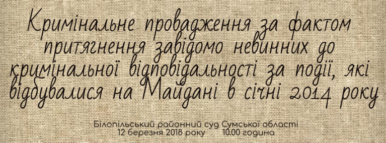 Для інформації: колишній прокурор прокуратури м. Сум С. обвинувачується в тому, що своїми умисними діями, які полягали в притягненні 27 січня 2014 року завідомо невинуватих Т.О., Т.Ю. і 28 січня 2014 року завідомо невинуватого К. до кримінальної відповідальності, поєднане з обвинуваченням у вчиненні тяжкого злочину, а також поєднане з іншою фальсифікацією, вчинив злочин, передбачений ч. 2 ст. 372 КК України (притягнення завідомо невинного до кримінальної відповідальності, поєднане з обвинуваченням у вчиненні тяжкого або особливо тяжкого злочину, а також поєднане зі штучним створенням доказів обвинувачення або іншою фальсифікацією).