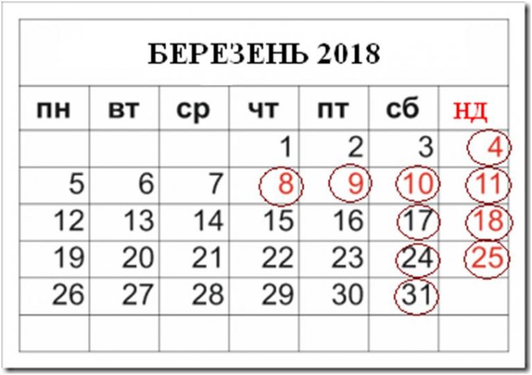 суддя Нагорна Н. В. здійснюватиме чергування 04, 08, 09, 10, 11, 17, 18, 24, 25, 31 березня 2018 року.