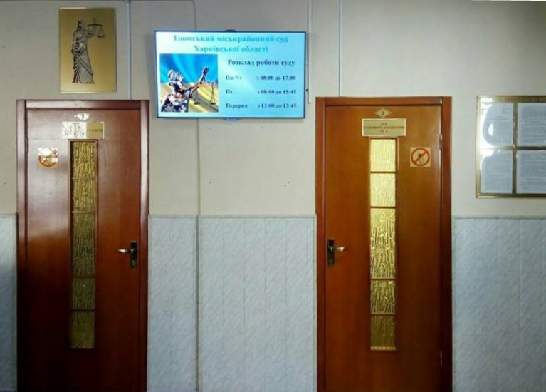 У приміщенні Ізюмського міськрайонного суду Харківської області з метою забезпечення його інформаційної насиченості розміщено інформаційне табло, за допомогою якого відвідувачам суду подається оперативна інформація згідно зі списками справ, призначених для розгляду, зразками документів, ставками судового сбору, платіжними реквізитами, графіком особистого прийому громадян керівництвом суду тощо.