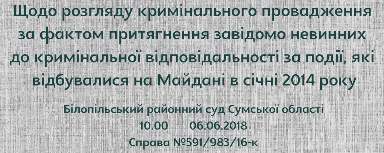 На 10 годину 06 червня 2018 року відкладено розгляд кримінального провадження за обвинувальним актом по обвинуваченню колишніх прокурора прокуратури м. Сум С. і слідчої слідчого відділу Сумського МВ УМВС України в Сумській області П., обвинувачених за ч. 2 ст. 372 КК України. У судовому засіданні були допитані свідки. У наступному судовому засіданні допит свідків буде продовжено.